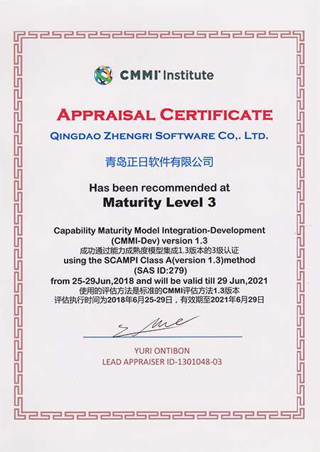 正日軟件是國家認定的高新技術企業(yè)和雙軟企業(yè),產(chǎn)品服務嚴格以ISO9001質(zhì)量體系認證標準執(zhí)行。此次CMMI3證書的成功取得,也進一步證明正日軟件在軟件設計、開發(fā)、項目管理及為客戶提供高質(zhì)量產(chǎn)品等方面付出了巨大精力投入,同時也獲得了客戶、行業(yè)及權威機構的認可。