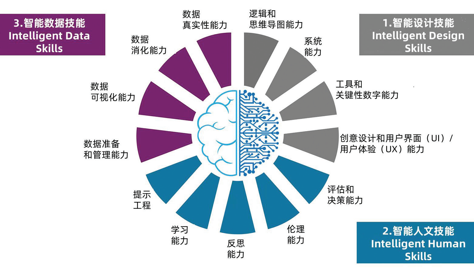 人類與人工智能之間強大的協(xié)同是世界快速發(fā)展的關(guān)鍵,而高校在塑造人工智能融合的未來方面發(fā)揮著舉足輕重的作用。這就要求進行靈活、創(chuàng)新和高瞻遠矚的教育改革,超越傳統(tǒng),培養(yǎng)能夠熟練運用人工智能推動社會進步的積極主動的領(lǐng)導者。這項改革的關(guān)鍵是培養(yǎng)三種能力——智能人文技能、智能數(shù)據(jù)技能和智能設(shè)計技能,并將其完美地融入課程和實踐中。這些能力對于培養(yǎng)學生的倫理素養(yǎng)、批判性思維和解決問題的能力至關(guān)重要,使學生有能力成為敏捷的創(chuàng)造者。