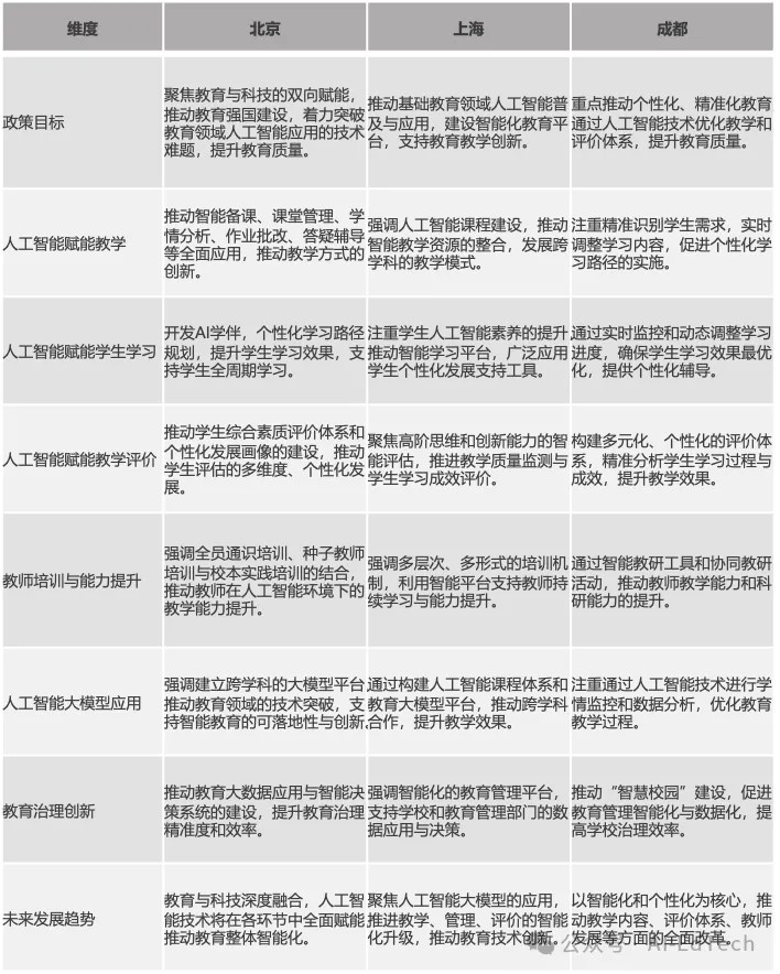 在教育評價方面,北京和上海的政策強調人工智能在教育評價中的應用,尤其是在通過大數據與智能化手段提升評價精準度和多維度。北京特別關注學生綜合素質評價和個性化發(fā)展畫像的建立,探索多元化的智能評價機制。上海注重智能化的教學質量監(jiān)測與學業(yè)成效評估,推動教育評價體系的精準化。成都則更加注重通過智能化評價體系精準分析學生學習效果,并為教學優(yōu)化提供數據支持。