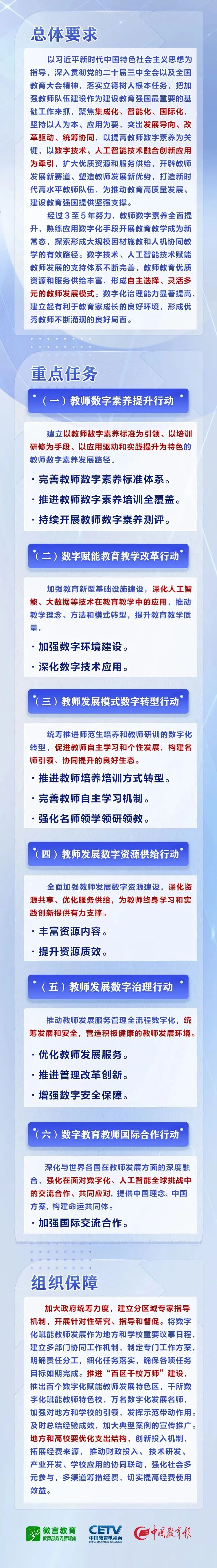 為深入貫徹落實《教育強國建設(shè)規(guī)劃綱要(2024—2035年)》和《中共中央 國務(wù)院關(guān)于弘揚教育家精神加強新時代高素質(zhì)專業(yè)化教師隊伍建設(shè)的意見》,按照教育部等部門《關(guān)于加快推進教育數(shù)字化的意見》部署,深入實施國家教育數(shù)字化戰(zhàn)略,深化教師隊伍改革創(chuàng)新,決定實施數(shù)字化賦能教師發(fā)展行動?,F(xiàn)將有關(guān)事項通知如下。