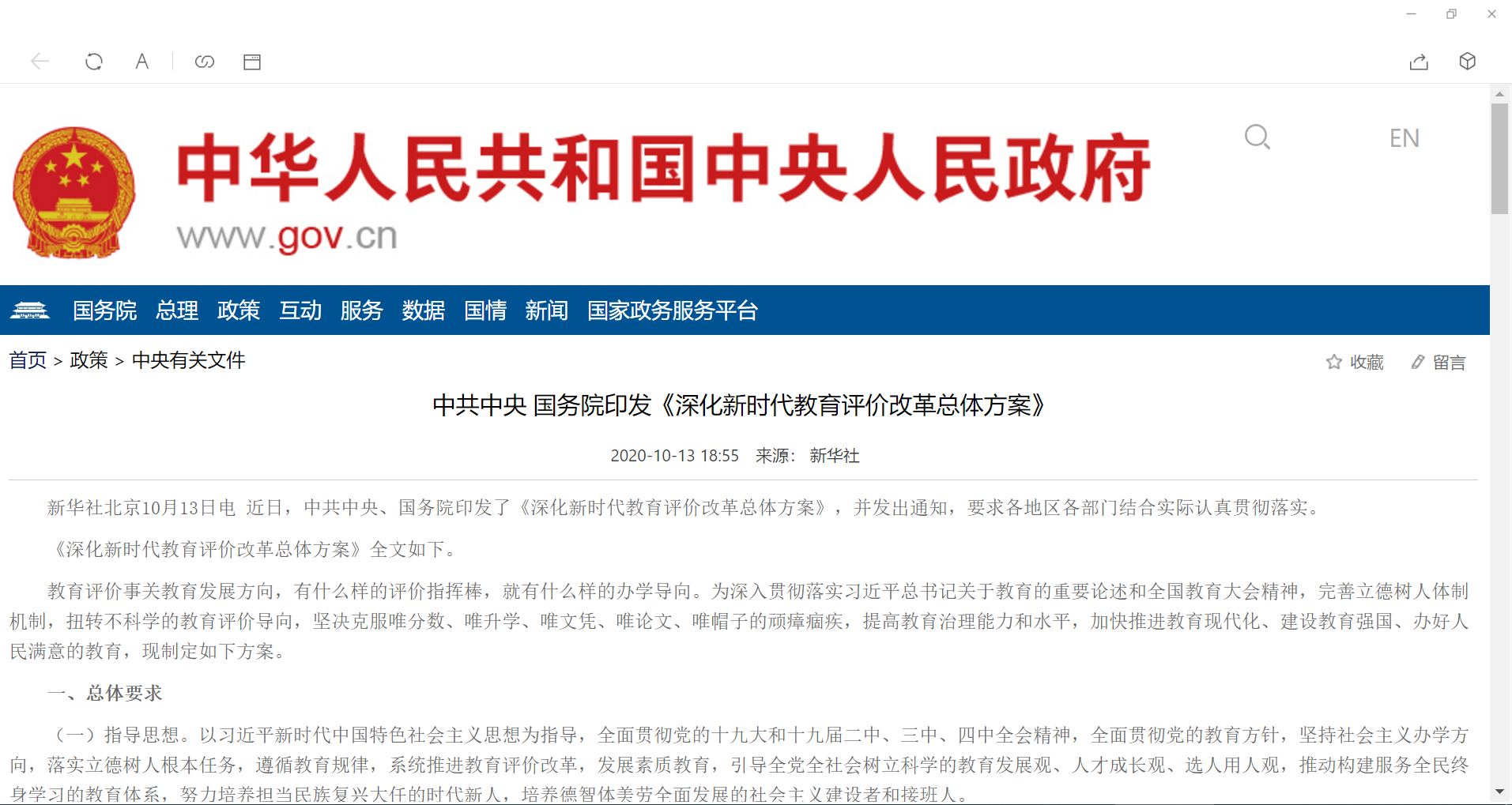 (三)改革目標(biāo)。經(jīng)過5至10年努力,各級黨委和政府科學(xué)履行職責(zé)水平明顯提高,各級各類學(xué)校立德樹人落實機(jī)制更加完善,引導(dǎo)教師潛心育人的評價制度更加健全,促進(jìn)學(xué)生全面發(fā)展的評價辦法更加多元,社會選人用人方式更加科學(xué)。到2035年,基本形成富有時代特征、彰顯中國特色、體現(xiàn)世界水平的教育評價體系。