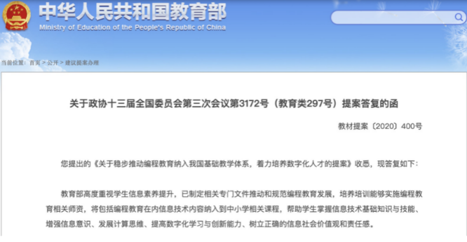 近日,教育部在給全國(guó)政協(xié)委員的答復(fù)函中稱,教育部高度重視學(xué)生信息素養(yǎng)提升,已制定相關(guān)專門(mén)文件推動(dòng)和規(guī)范編程教育發(fā)展,培養(yǎng)培訓(xùn)能夠?qū)嵤┚幊探逃嚓P(guān)師資,將包括編程教育在內(nèi)信息技術(shù)內(nèi)容納入中小學(xué)相關(guān)課程,幫助學(xué)生掌握信息技術(shù)基礎(chǔ)知識(shí)與技能、增強(qiáng)信息意識(shí)、發(fā)展計(jì)算思維、提高數(shù)字化學(xué)習(xí)與創(chuàng)新能力、樹(shù)立正確的信息社會(huì)價(jià)值觀和責(zé)任感。