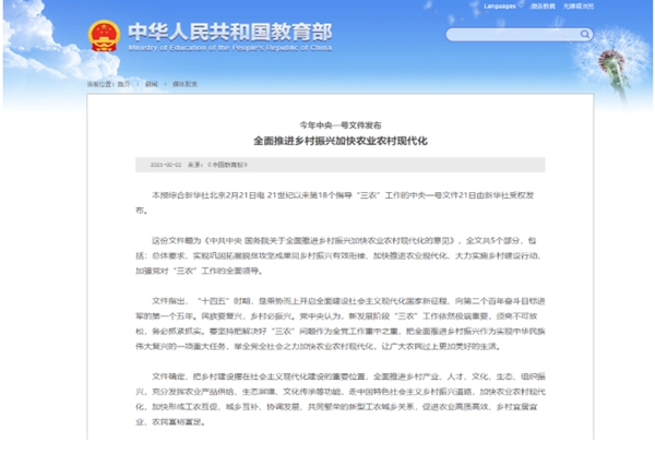 2月21日,“十四五”時期首個中央一號文件由新華社受權發(fā)布。文件題為《中共中央 國務院關于全面推進鄉(xiāng)村振興加快農業(yè)農村現(xiàn)代化的意見》,這份指導今年乃至“十四五”時期“三農”工作的重要文件中多個要點提及教育助力鄉(xiāng)村振興。包括:支持高校為鄉(xiāng)村振興提供智力服務。提高農村教育質量,多渠道增加農村普惠性學前教育資源供給,繼續(xù)改善鄉(xiāng)鎮(zhèn)寄宿制學校辦學條件,保留并辦好必要的鄉(xiāng)村小規(guī)模學校,在縣城和中心鎮(zhèn)新建改擴建一批高中和中等職業(yè)學校。完善農村特殊教育保障機制。推進縣域內義務教育學校校長教師交流輪崗,支持建設城鄉(xiāng)學校共同體。面向農民就業(yè)需求,發(fā)展職業(yè)技術教育與技能培訓,建設一批產教融合基地。開展耕讀教育。加快發(fā)展面向鄉(xiāng)村的網絡教育,加大涉農高校、涉農職業(yè)院校、涉農學科專業(yè)建設力度等等。