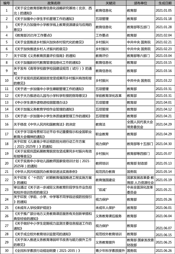 除以上五方面重要主題之外,上半年還出臺了教育信息化、教師培訓、青少年科學素質提升等方面的重要政策,對照《教育部2021年工作要點》部署的工作主線和重點任務,這些領域的政策預計在下半年還會有重磅的規(guī)劃性文件或落實舉措出臺,并且在高等教育提質創(chuàng)新、高水平教育對外開放、精品教材建設、家校社協(xié)同育人、普通高中多樣化特色發(fā)展等方面也將陸續(xù)有重要政策出臺,以新的發(fā)展理念和發(fā)展模式,全面深化改革,推動教育高質量發(fā)展。