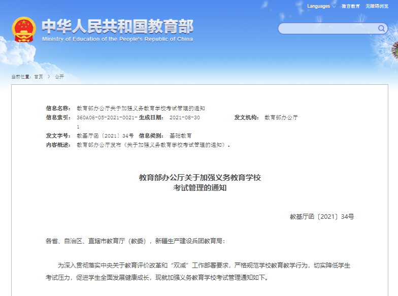 為深入貫徹落實(shí)中央關(guān)于教育評(píng)價(jià)改革和“雙減”工作部署要求,嚴(yán)格規(guī)范學(xué)校教育教學(xué)行為,切實(shí)降低學(xué)生考試壓力,促進(jìn)學(xué)生全面發(fā)展健康成長(zhǎng),現(xiàn)就加強(qiáng)義務(wù)教育學(xué)??荚嚬芾硗ㄖ缦?。