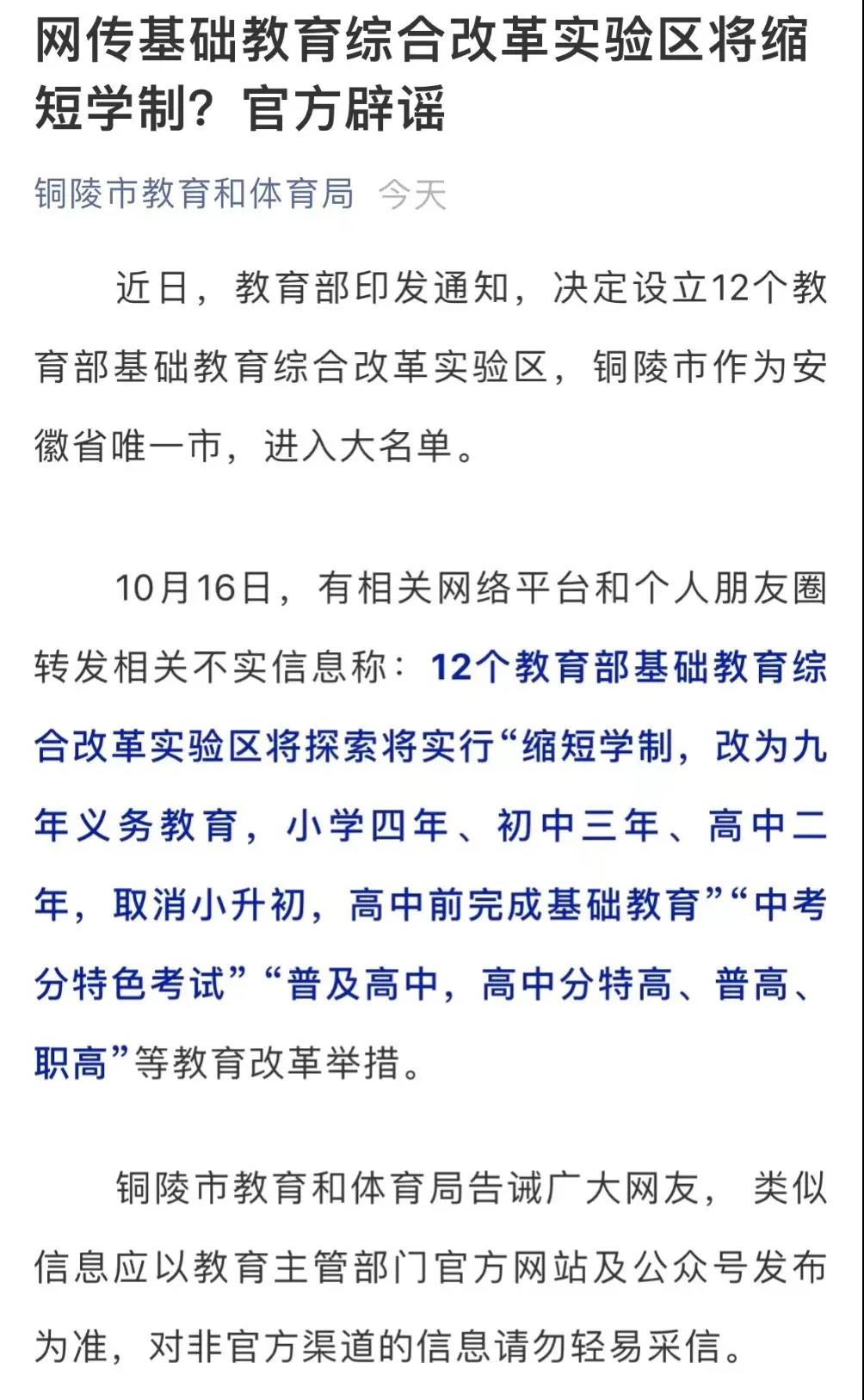 網傳基礎教育綜合改革實驗區(qū)將縮短學制?