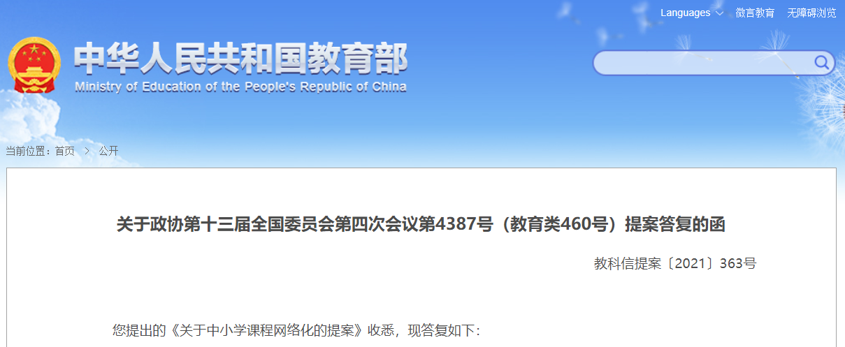 您提出的《關(guān)于中小學(xué)課程網(wǎng)絡(luò)化的提案》收悉,現(xiàn)答復(fù)如下: