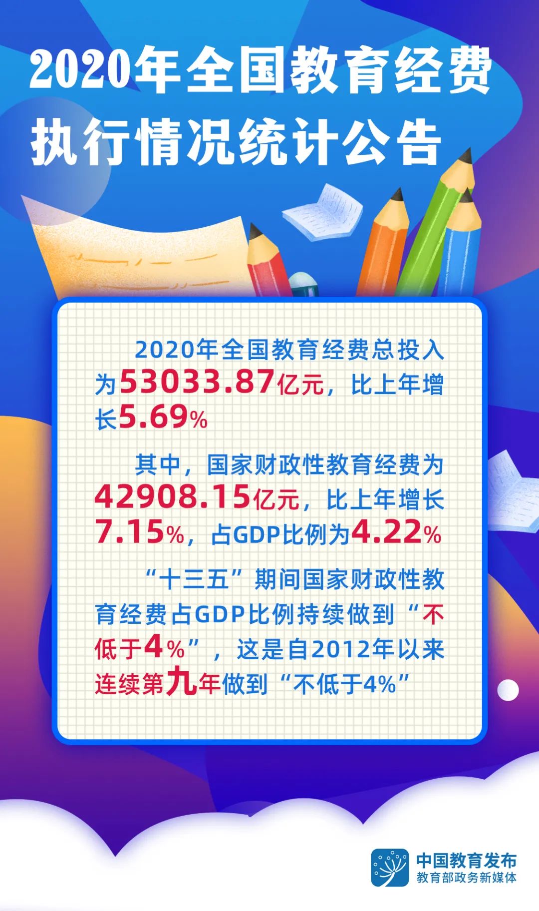 教育部、國家統(tǒng)計局、財政部近日發(fā)布了《關(guān)于2020年全國教育經(jīng)費執(zhí)行情況統(tǒng)計公告》(以下簡稱“《公告》”)。《公告》顯示,2020年全國教育經(jīng)費總投入為53033.87億元,比上年的50178.12億元增長5.69%。