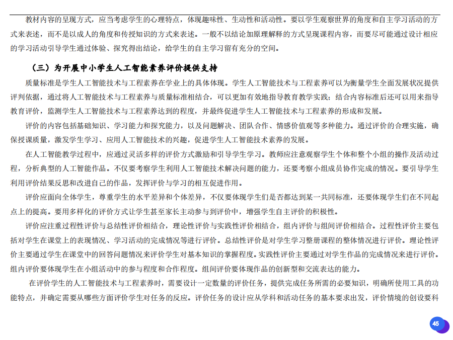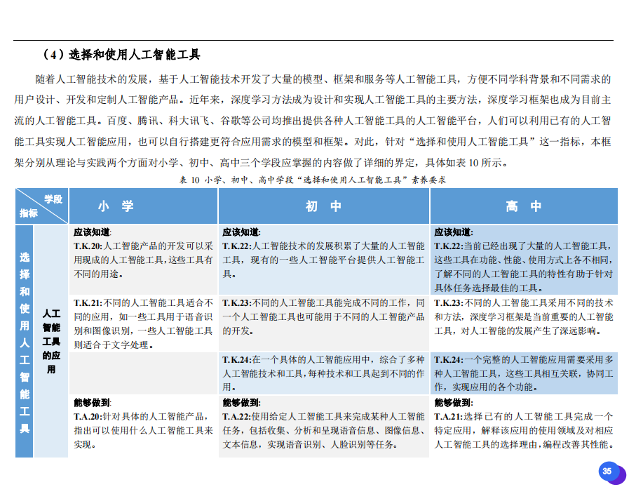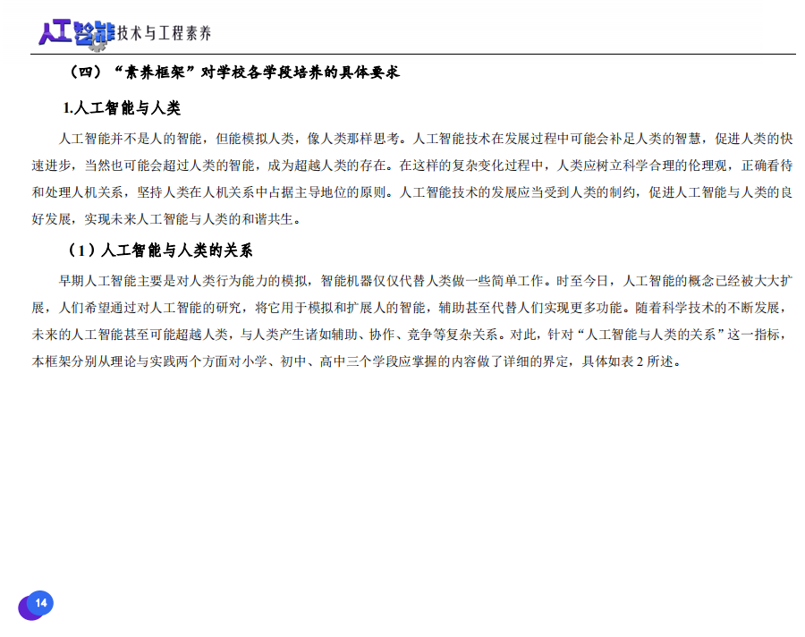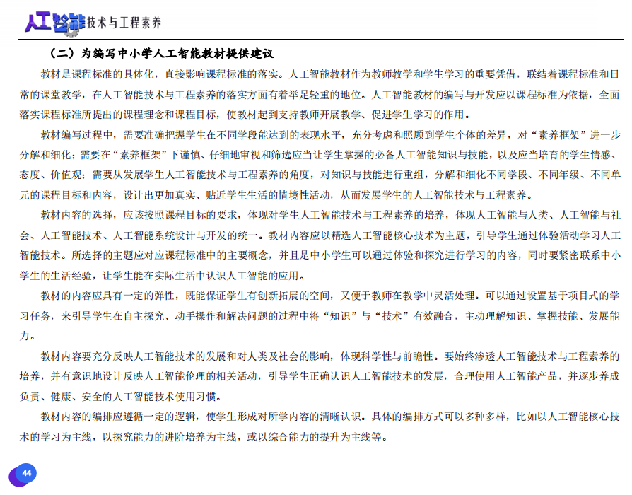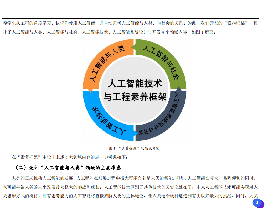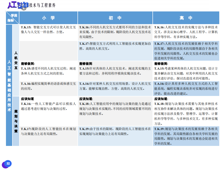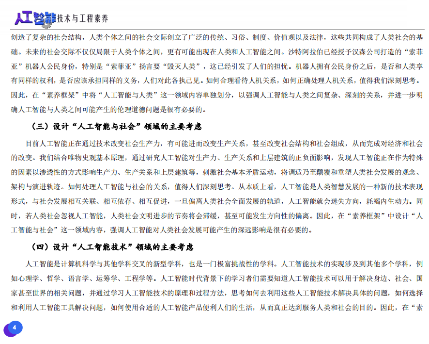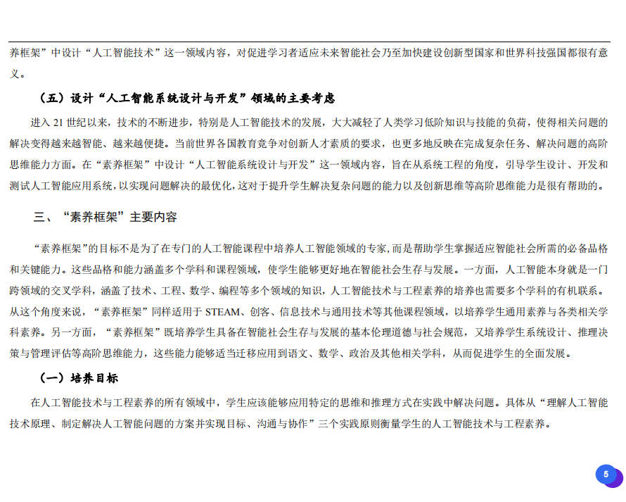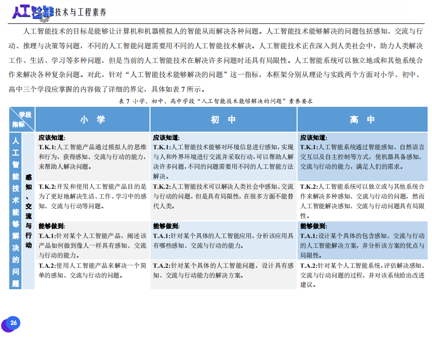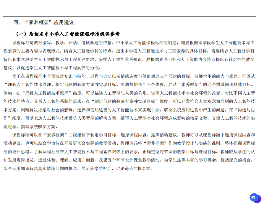 此次發(fā)布的《素養(yǎng)框架》包含人工智能與人類、人工智能與社會(huì)、人工智能與技術(shù)、人工智能系統(tǒng)設(shè)計(jì)與開發(fā)四個(gè)領(lǐng)域,可為中小學(xué)普及人工智能教育的標(biāo)準(zhǔn)制定、教材編寫、課程開設(shè)、素養(yǎng)評價(jià)提供重要參考,將推動(dòng)人工智能教育從知識教育向素養(yǎng)教育的轉(zhuǎn)變?!端仞B(yǎng)框架》發(fā)布后,將不斷吸收有關(guān)意見和建議,逐步完善和更新。