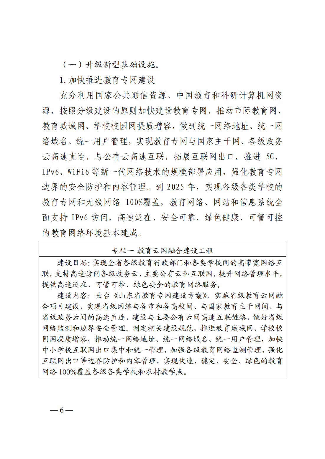(一)升級(jí)新型基礎(chǔ)設(shè)施:1、加快推進(jìn)教育專(zhuān)網(wǎng)建設(shè);2、升級(jí)智慧校園基礎(chǔ)設(shè)施;3、完善教育服務(wù)平臺(tái)體系。