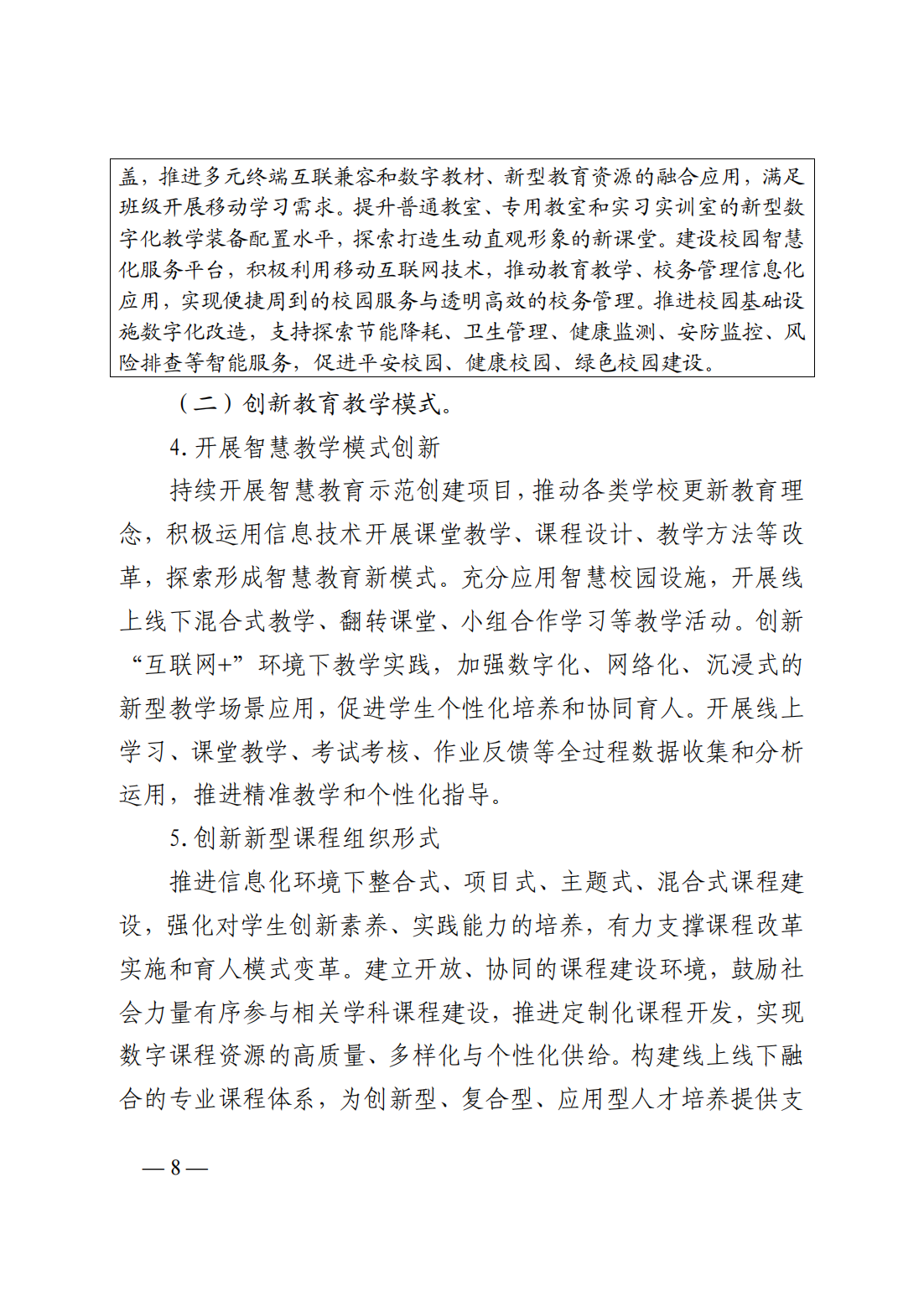 (二)創(chuàng)新教育教學(xué)模式:1、開(kāi)展智慧教學(xué)模式創(chuàng)新;2、創(chuàng)新新型課程組織形式;3、加快教育評(píng)價(jià)手段創(chuàng)新