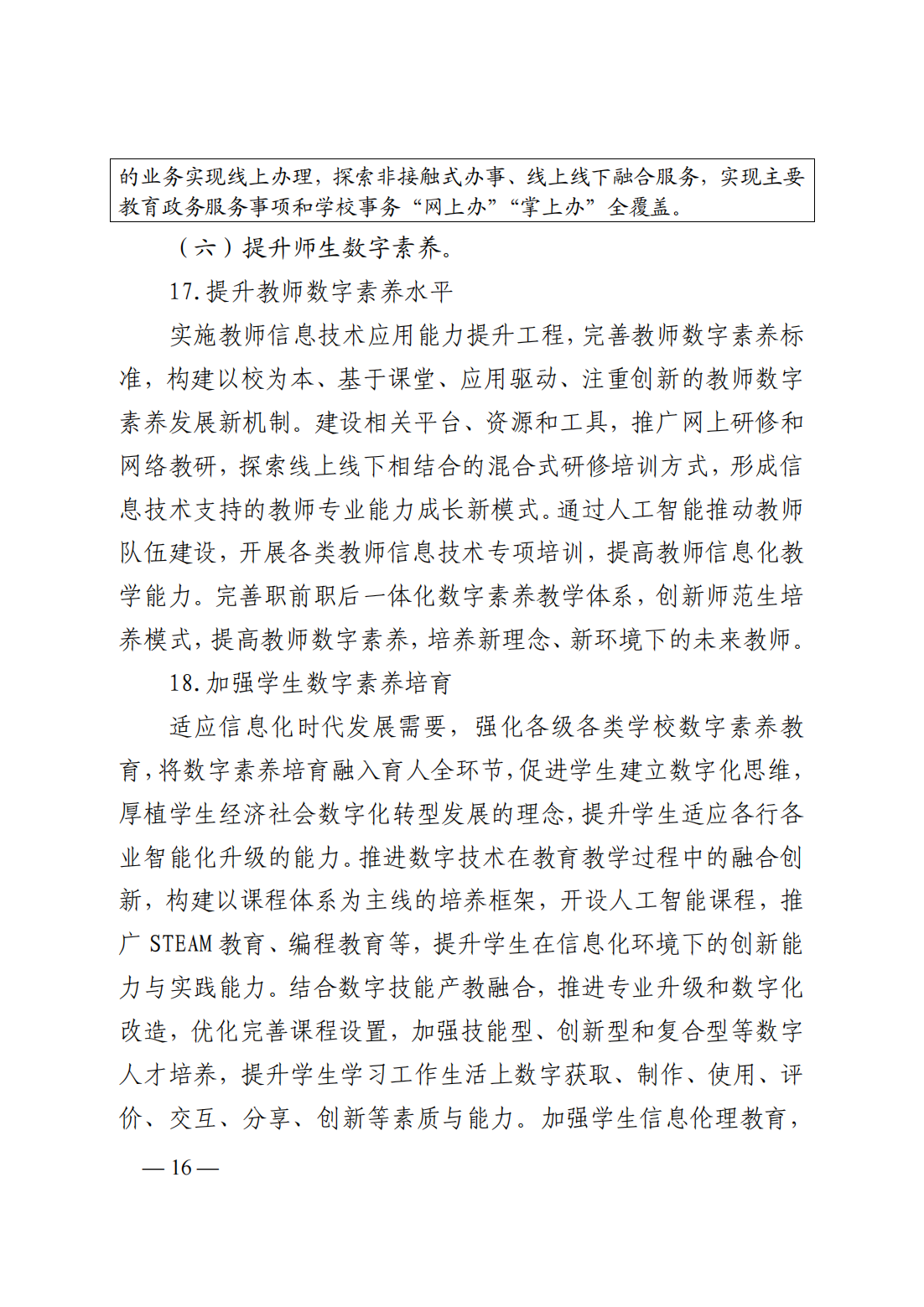 (六)提升師生數(shù)字素養(yǎng):1、提升教師數(shù)字素養(yǎng)水平;2、加強(qiáng)學(xué)生數(shù)字素養(yǎng)培育;3、開(kāi)展數(shù)字素養(yǎng)水平監(jiān)測(cè)
