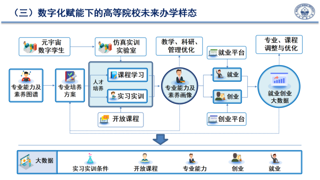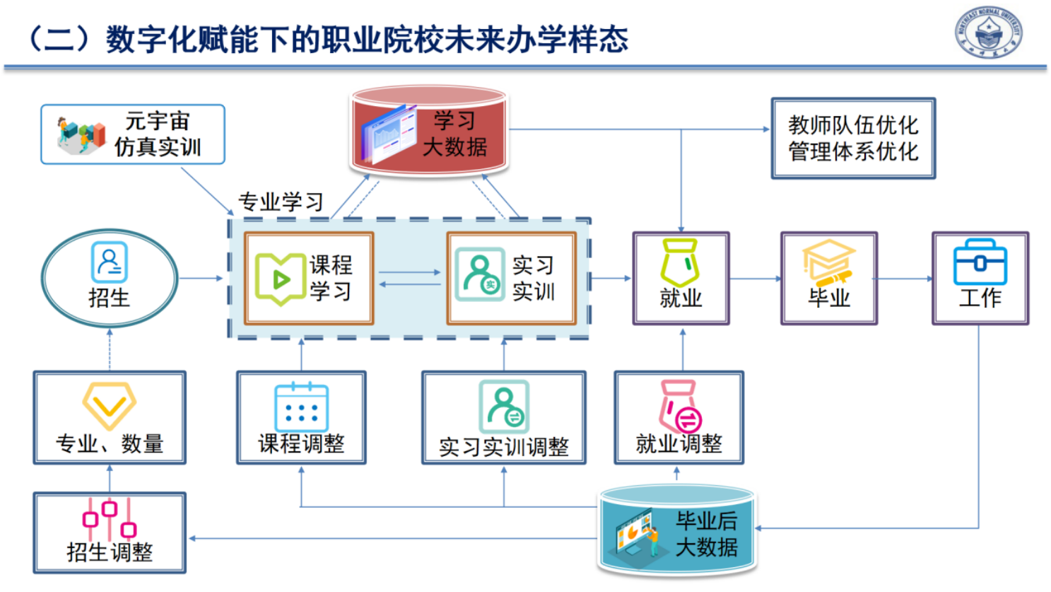 未來職業(yè)教學(xué)樣態(tài)一定是從學(xué)生的招生、課程學(xué)習(xí)、實(shí)習(xí)實(shí)訓(xùn)、就業(yè)、畢業(yè)、工作的全過程閉環(huán)。其中包括數(shù)據(jù)賦能,VR、AR賦能、人工智能手段工具賦能等等,從而形成一體化聯(lián)動(dòng)體系。