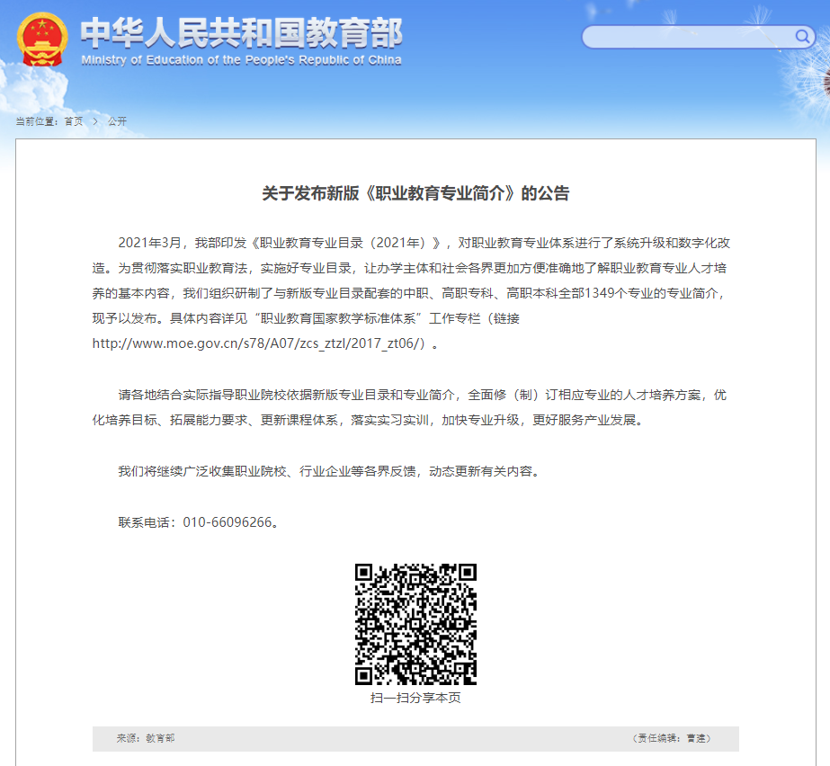 近日,教育部發(fā)布新版《職業(yè)教育專業(yè)簡(jiǎn)介》(以下簡(jiǎn)稱《簡(jiǎn)介》)。新版《簡(jiǎn)介》全面貫徹新發(fā)展理念,服務(wù)產(chǎn)業(yè)轉(zhuǎn)型升級(jí)需要,展現(xiàn)職業(yè)教育專業(yè)升級(jí)與數(shù)字化改造的最新成果,覆蓋新版專業(yè)目錄全部19個(gè)專業(yè)大類、97個(gè)專業(yè)類的1349個(gè)專業(yè)。其中,中等職業(yè)教育358個(gè),高等職業(yè)教育???44個(gè),高等職業(yè)教育本科247個(gè)。