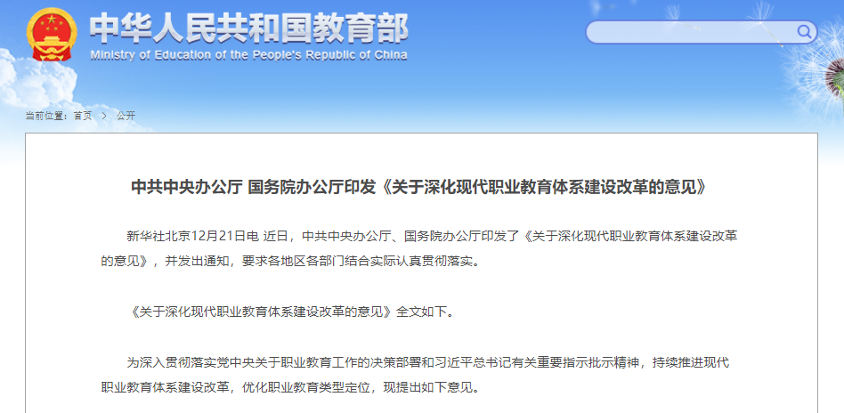 《關于深化現(xiàn)代職業(yè)教育體系建設改革的意見》全文如下。