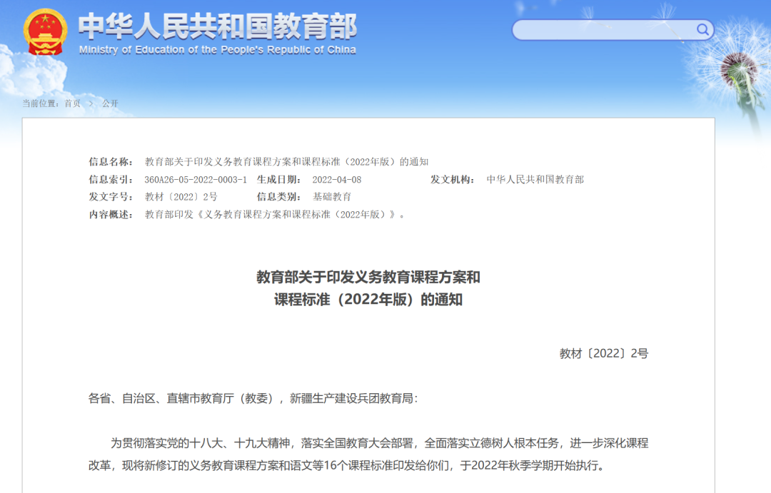 2022年4月,教育部印發(fā)《義務教育課程方案和課程標準(2022年版)》,本次修訂堅持以習近平新時代中國特色社會主義思想為指導,全面貫徹黨的教育方針,落實立德樹人根本任務,對義務教育課程進行了整體設計和系統(tǒng)完善。