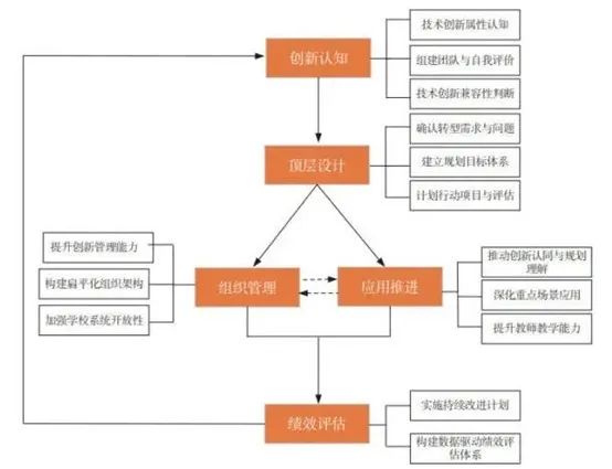 學(xué)校的數(shù)字化轉(zhuǎn)型是學(xué)校教育適應(yīng)外部數(shù)字時(shí)代發(fā)展環(huán)境和內(nèi)部創(chuàng)新人才培養(yǎng)模式的發(fā)展需求的過程。在學(xué)校數(shù)字化轉(zhuǎn)型的行動(dòng)層面,如下圖所示,學(xué)校組織應(yīng)能克服技術(shù)創(chuàng)新帶來的焦慮,通過創(chuàng)新認(rèn)知提升學(xué)校組織的創(chuàng)新性,根據(jù)學(xué)校轉(zhuǎn)型需求與學(xué)?,F(xiàn)狀水平的差距規(guī)劃學(xué)校數(shù)字化轉(zhuǎn)型的頂層設(shè)計(jì),圍繞應(yīng)用推進(jìn)與深化組織管理變革開展數(shù)字化建設(shè)實(shí)施,并構(gòu)建數(shù)據(jù)驅(qū)動(dòng)的績效評(píng)估體系持續(xù)改進(jìn)數(shù)字化建設(shè),提高信息技術(shù)創(chuàng)新與現(xiàn)有學(xué)校建設(shè)之間的兼容性并能夠?qū)⒔逃齽?chuàng)新逐漸納入到日常教育教學(xué)業(yè)務(wù)實(shí)踐中,推動(dòng)學(xué)校教育的變革與創(chuàng)新突破,最終實(shí)現(xiàn)學(xué)校教育的高質(zhì)量發(fā)展。