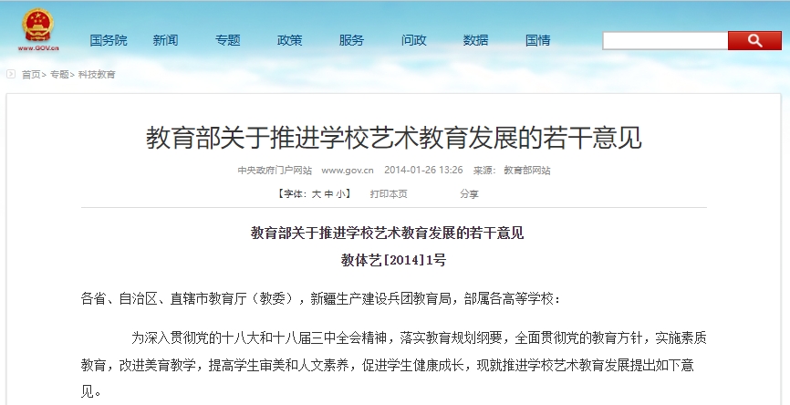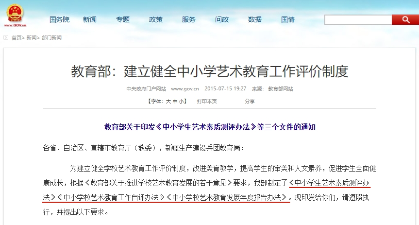 2015年,相繼印發(fā)了《中小學(xué)生藝術(shù)素質(zhì)測評辦法》、《中小學(xué)校藝術(shù)教育工作自評辦法》、《中小學(xué)學(xué)校藝術(shù)教育發(fā)展年度報(bào)告辦法》三個(gè)文件。
