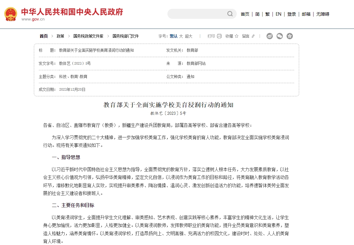 2023年,教育部印發(fā)《關(guān)于全面實(shí)施學(xué)校美育浸潤行動的通知》,明確深化美育評價(jià)改革,發(fā)揮評價(jià)的牽引和導(dǎo)向作用,完善初高中藝術(shù)科目學(xué)業(yè)水平考試,將美育評價(jià)納入學(xué)生綜合素質(zhì)檔案。一起來回顧近幾年出臺的美育相關(guān)政策與措施: