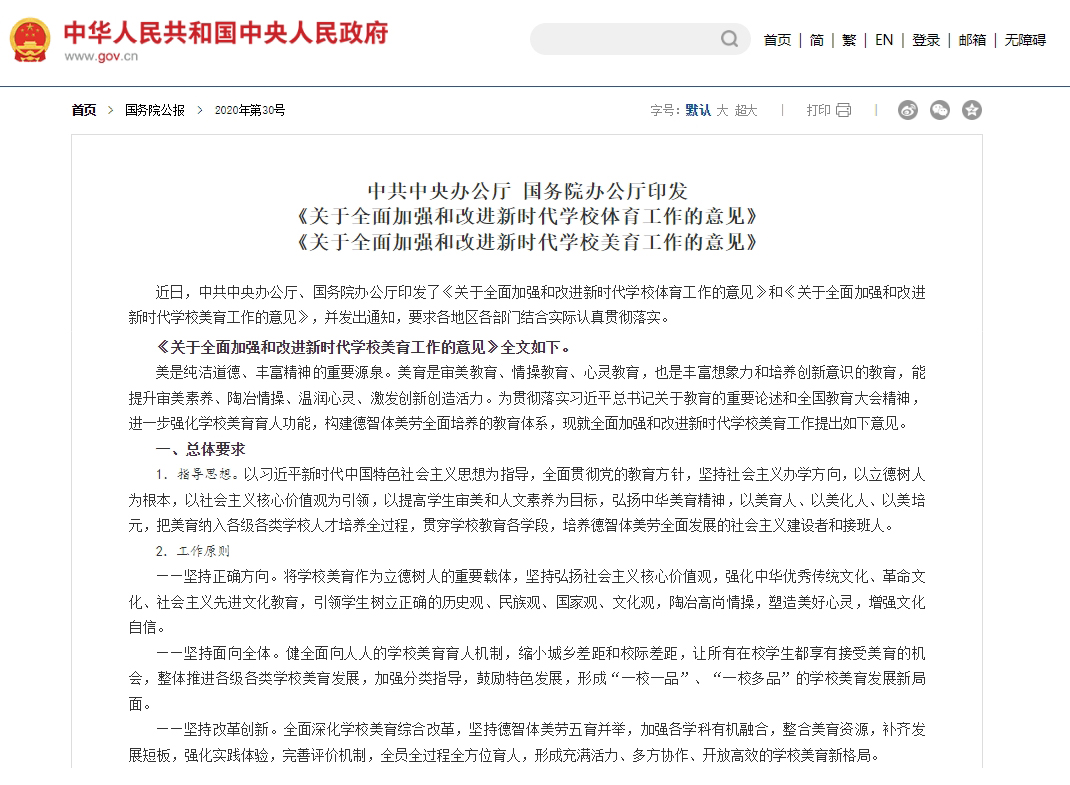 2020年,國務(wù)院辦公廳印發(fā)《關(guān)于全面加強(qiáng)和改進(jìn)學(xué)校美育工作的意見》中指出要全面實(shí)施中小學(xué)藝術(shù)素質(zhì)測評,將測評結(jié)果納入初、高中學(xué)生綜合素質(zhì)評價(jià)。探索將藝術(shù)類科目納入中考改革試點(diǎn),納入高中階段學(xué)??荚囌猩浫∮?jì)分科目。