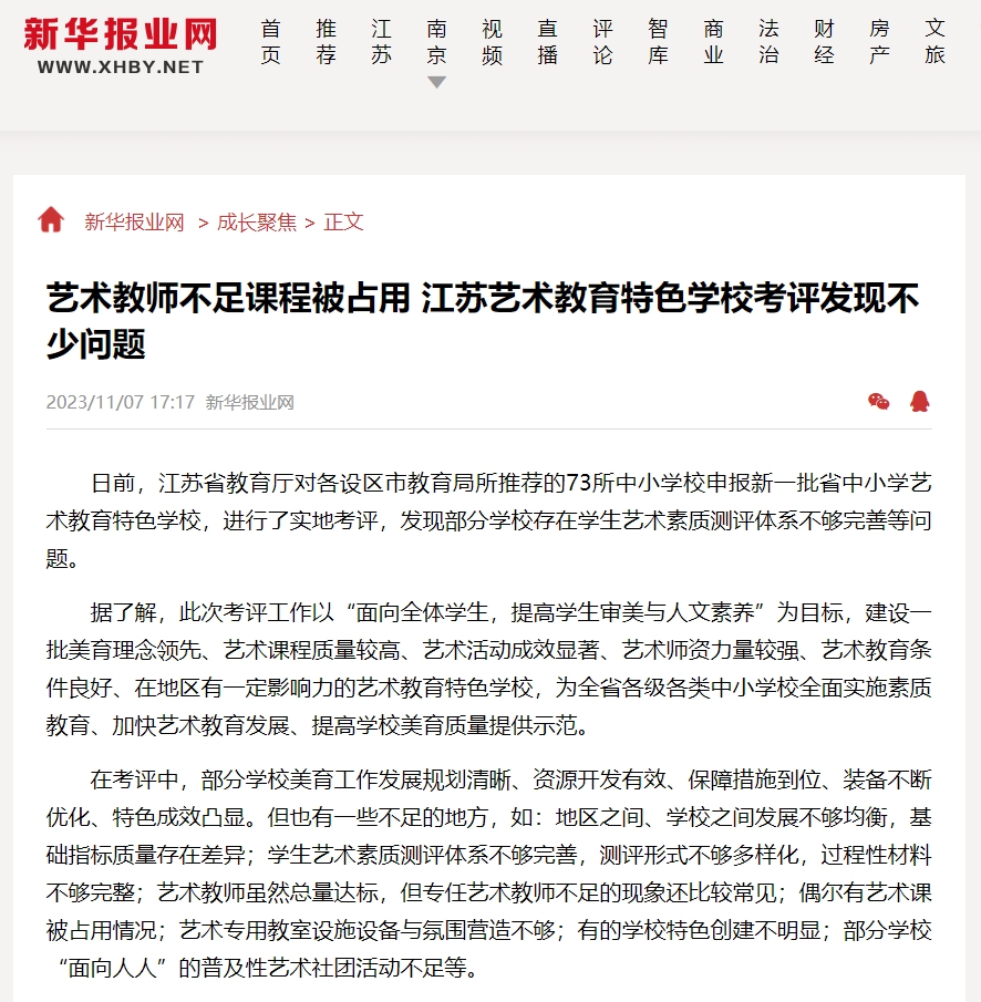 各地市在探索藝術(shù)考試、推動藝術(shù)中考實(shí)施等工作上取得一定成效,但在推動過程中也發(fā)現(xiàn)一些問題。例如2023年,江蘇省教育廳實(shí)地考評了新一批申報(bào)省中小學(xué)藝術(shù)教育特色的73所學(xué)校,發(fā)現(xiàn)部分學(xué)校存在學(xué)生藝術(shù)素質(zhì)測評體系不夠完善、測評形式不夠多樣化、過程性材料不夠完整等問題。