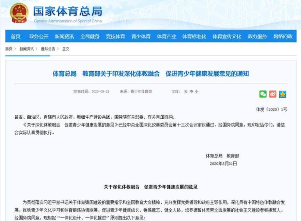 體育總局教育部關(guān)于印發(fā)深化體教融合促進(jìn)青少年健康發(fā)展意見(jiàn)的通知