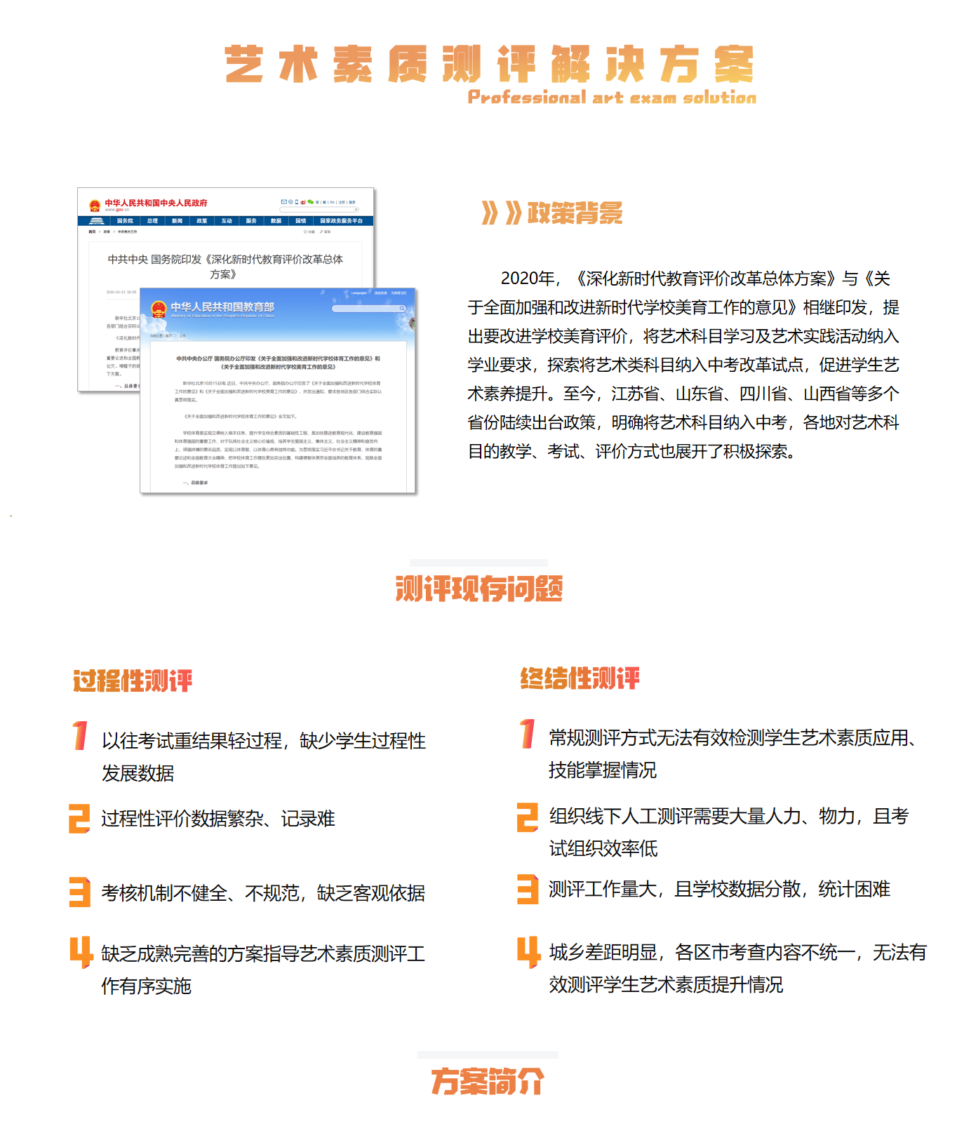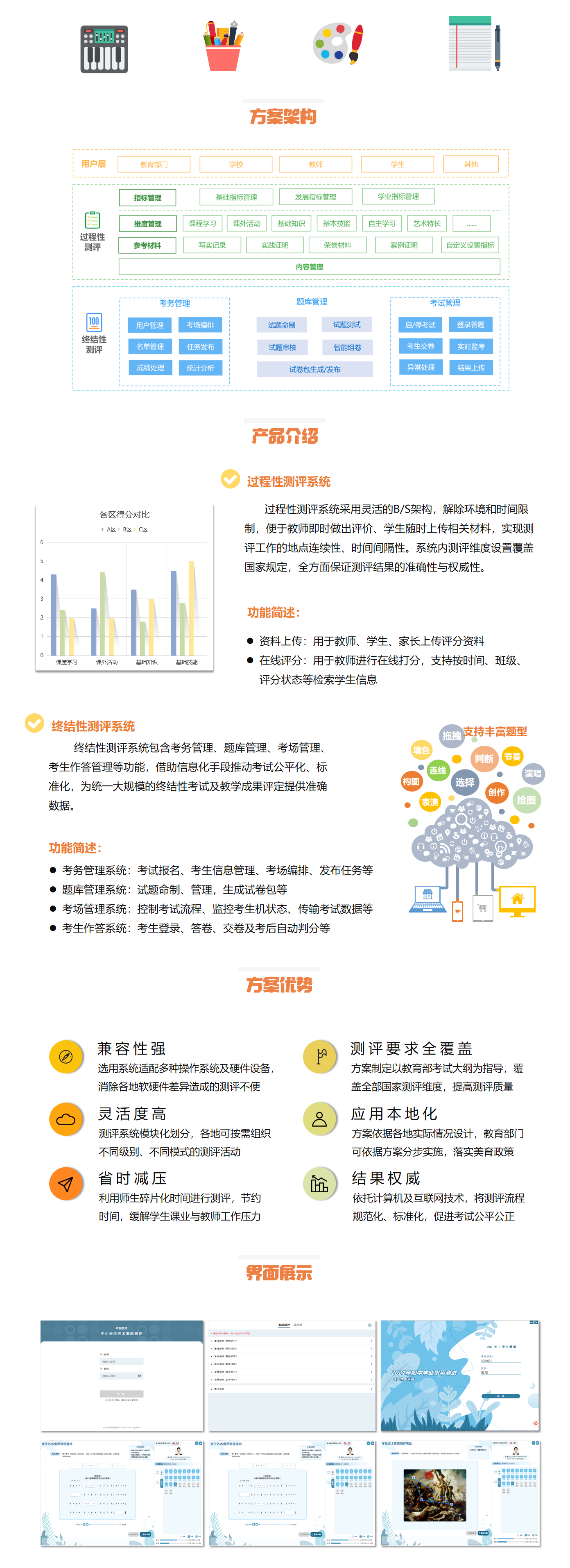 正日中小學藝術素質測評解決方案,是依托公司多年研發(fā)和服務基礎,緊跟美育政策打造的系統(tǒng)性解決方案。方案針對國內藝術素質測評的相關要求,對原有的信息管理、制卷組考、評卷分析等技術進行進一步優(yōu)化及融合,最終形成正日藝術考試系統(tǒng)。通過該解決方案,有助于教育部門落實美育政策,打造藝術測評全場景,實現(xiàn)美育高質改革。