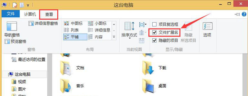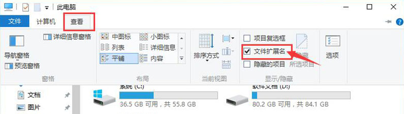 打開“查看”選項(xiàng)卡,勾選上“文件擴(kuò)展名”即可