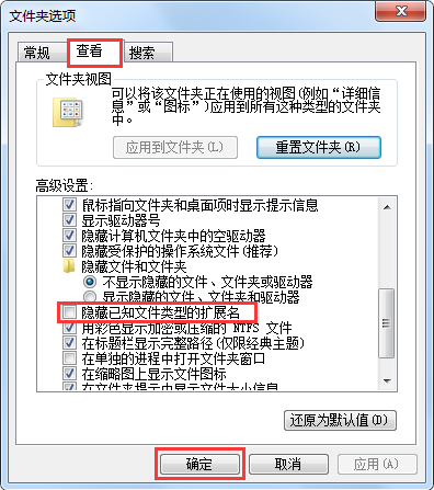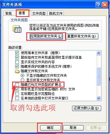 ③打開“查看”選項(xiàng)卡,去掉勾選“隱藏已知文件類型的擴(kuò)展名” ,單擊“確定”即可