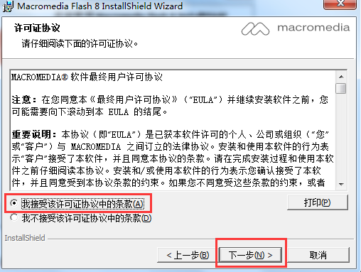 ⑤在彈出的界面上選擇“我接受……”,然后單擊“下一步”